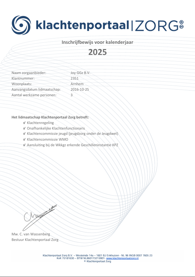 Joy GGz is aangesloten bij een onafhankelijk klachtenorgaan. U kunt een externe klacht indienen via: